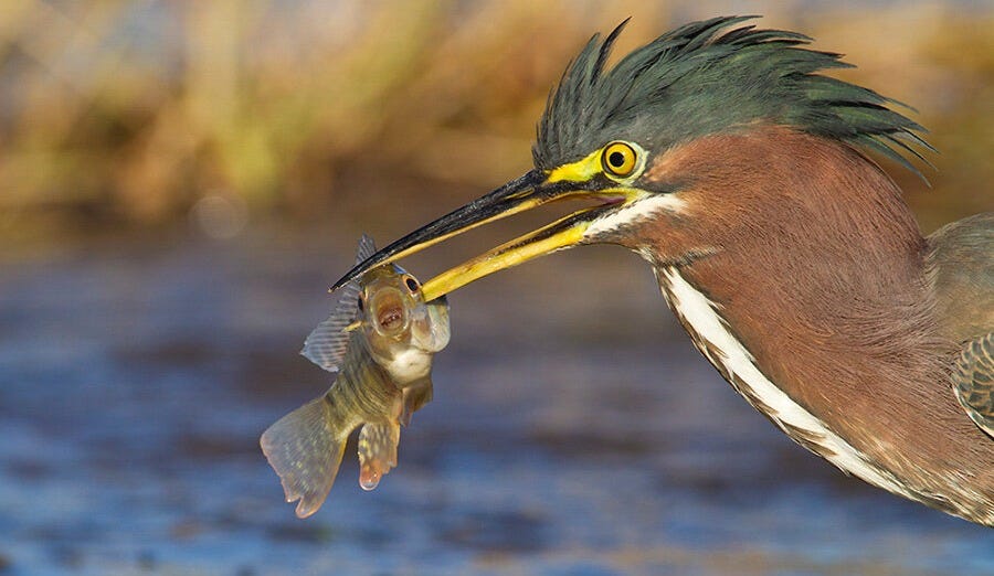 There’s a heron spearing a fish. One moment you’re a fish the next you’re a fish with a heron-beak-shaped hole in you. The sound it makes reminds me of a video of a guy getting stabbed that my friend showed me in high school. It’s less dramatic than in the movies. Just a body trying to figure out why it’s dying, flailing with zero purpose beyond recognition of pain.